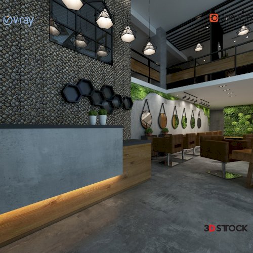 Beauty Salon Model, counters, mirrors, wall plants, safe, pendant lighting models.