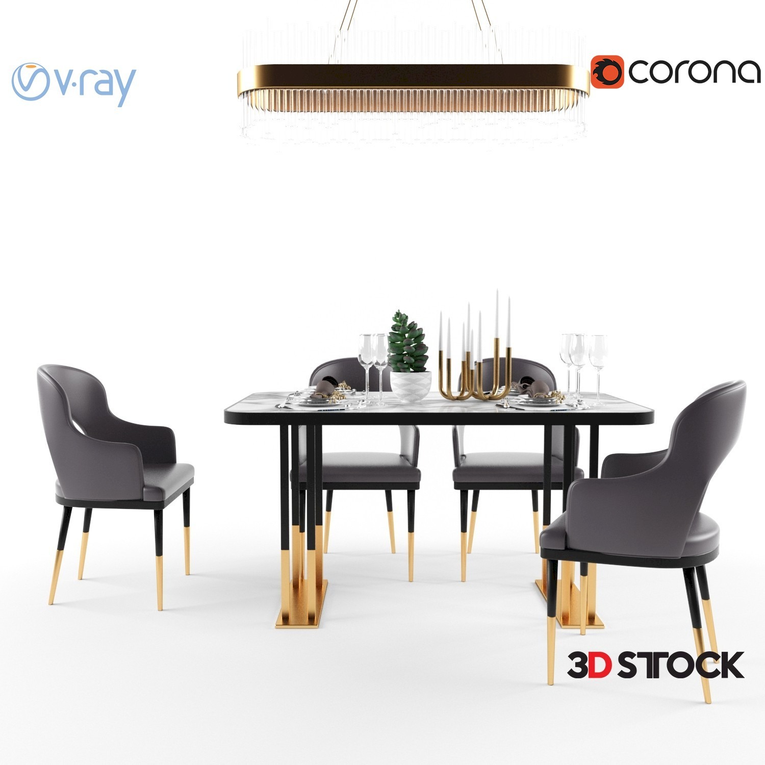 Black dining table set.Glass, cup, decorative plant, fork, spoon, knife, plate, napkin.