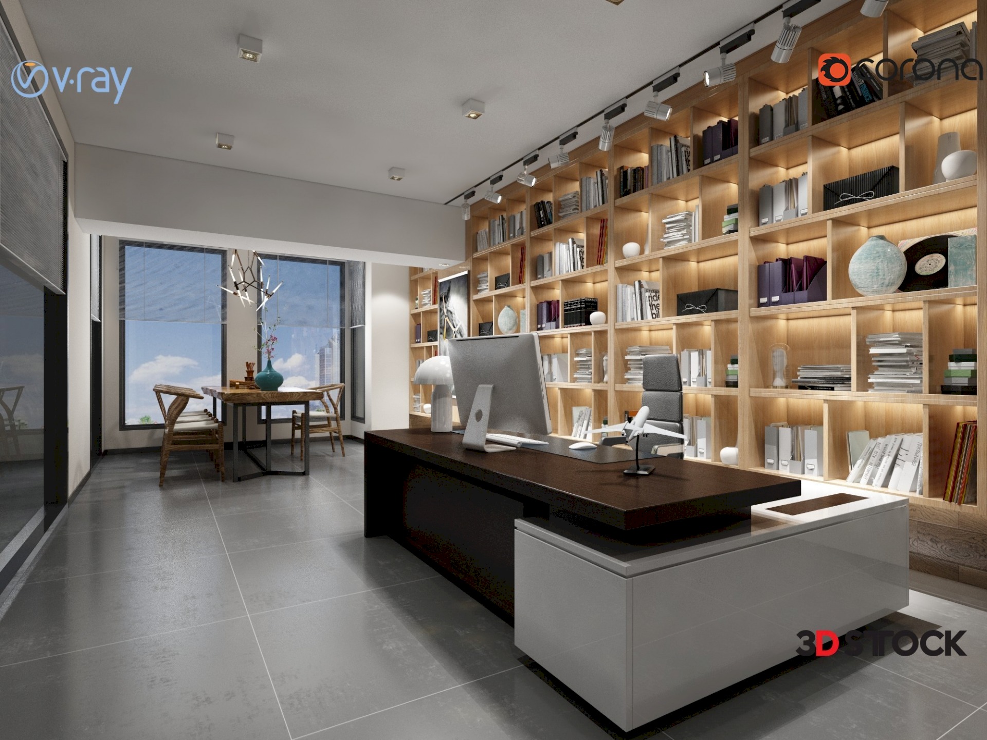 Executive room, bookshelf, computer desk, computer, desk, chair, ceiling lighting.