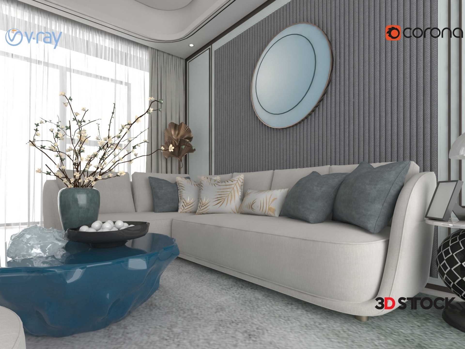 White living room set, gray carpet, white armchair, white sofa, ceiling lighting, lampshade, nightstand, decorative products.