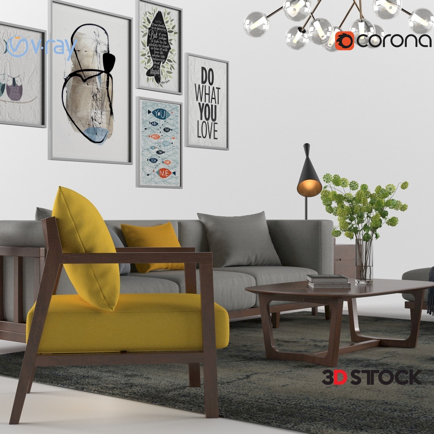 Livingroom, Set, Armchair, Sofa, Plant, Vase, Celling Light, Carpet, 3d Model, 3d Model Set