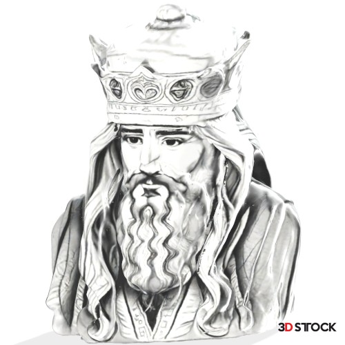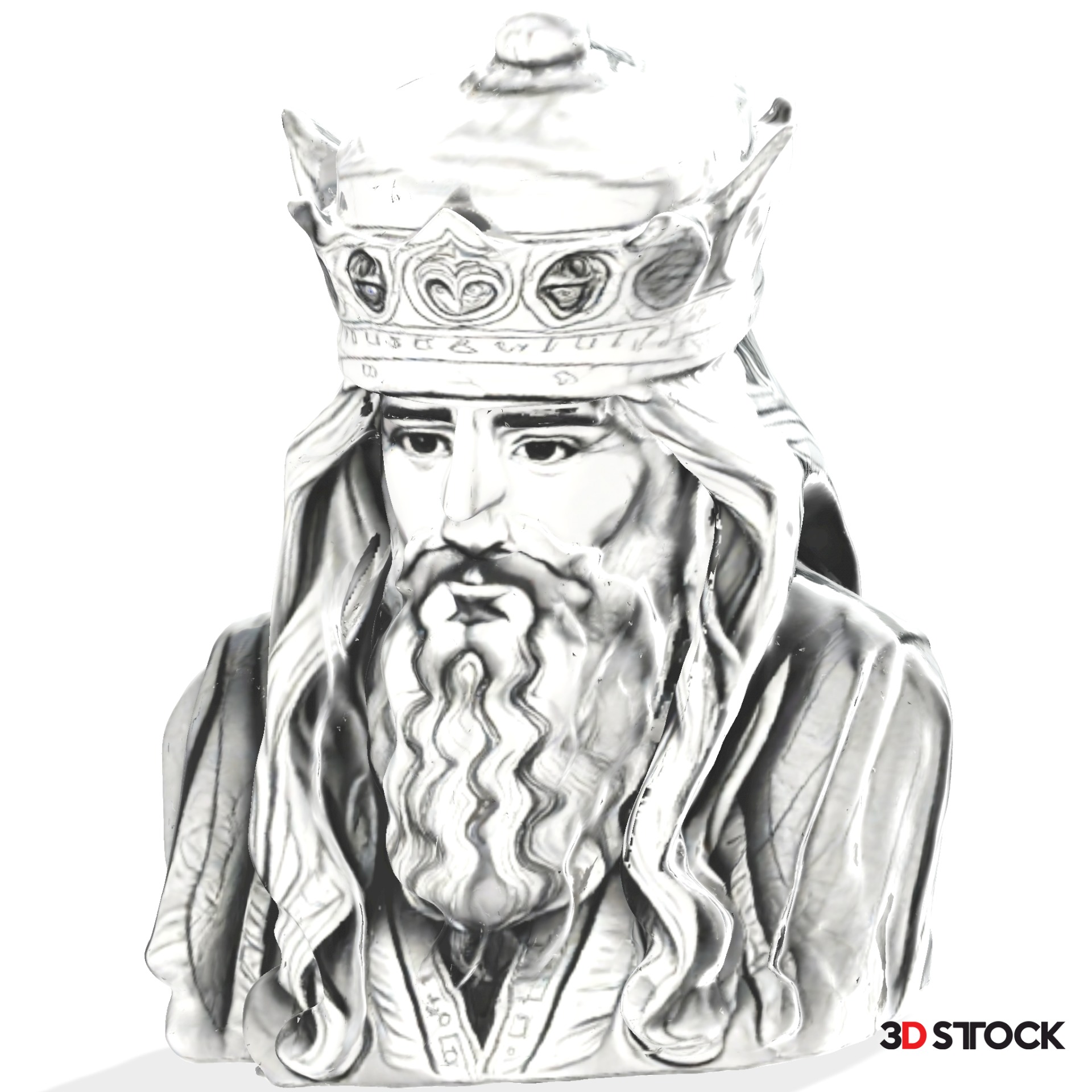 This 3D printable model features a detailed bust of a medieval king or royal figure with an ornate crown and flowing beard. The sculpture captures the regal essence of historical monarchy with intricate details in the crown's jewels and engravings. The design includes the king's distinguished facial features, wavy beard, and draped royal garments that add to the majestic appearance.