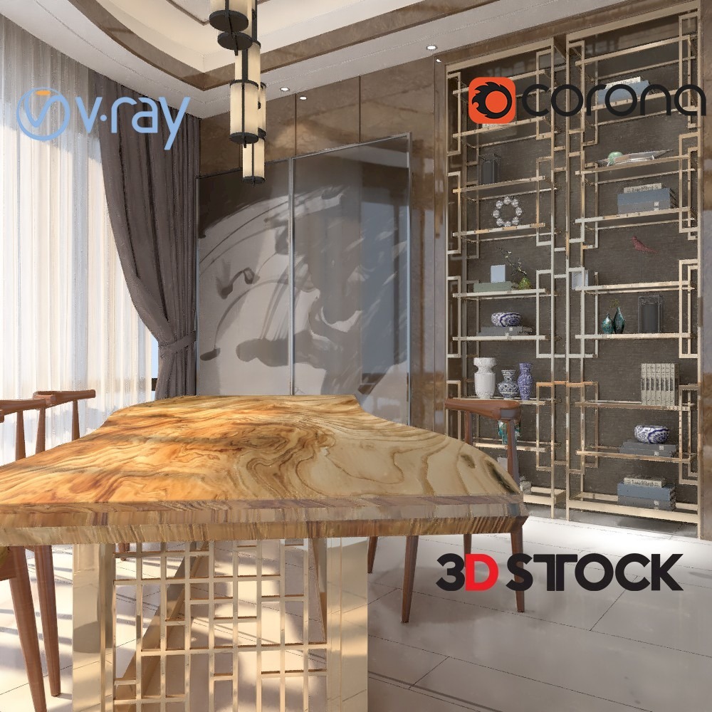 Office Set Table Chair Workstation Vase Plant Spot Light Bookshelf Book Floor Ventilation Pipes Frame Art Storage