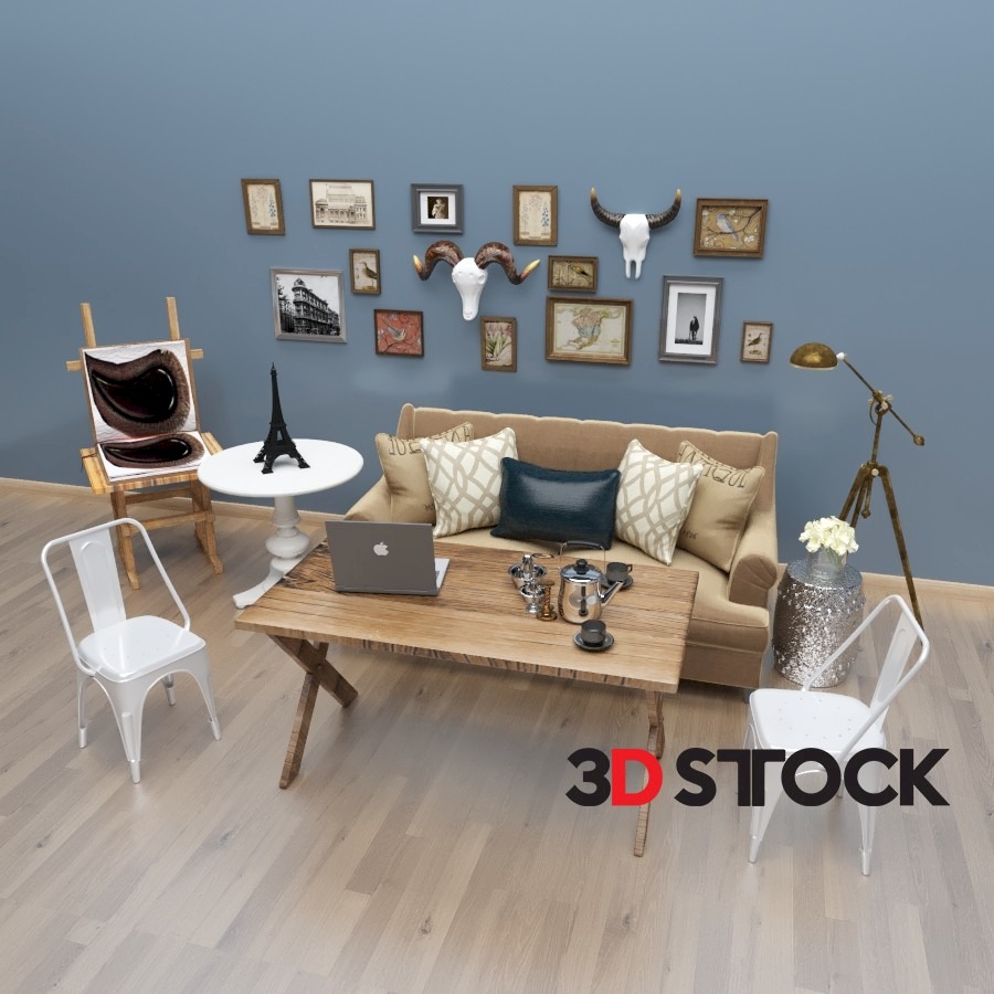 Table Set Sofa Chair Art Frame Vase Flower Floor Lamp Pillow Laptop Teapot Cup Wood Parquet Wall Plinth Side Table