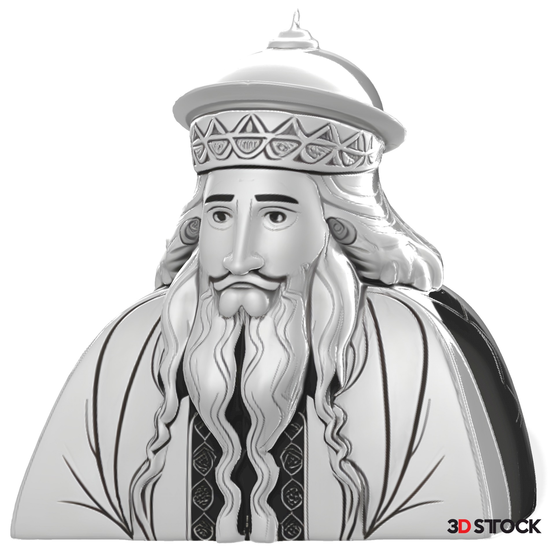 This intricately designed 3D model features a wise-looking man with a long flowing beard and ornate headwear. The bust captures exceptional detail in the facial features, including expressive eyes, a prominent mustache, and a wavy beard that cascades down. The figure wears what appears to be regal or ceremonial attire with decorative patterns and a distinctive cap or crown with geometric designs along the band. The monochromatic white/gray finish gives it a classic sculpture appearance, perfect for display as a decorative element.