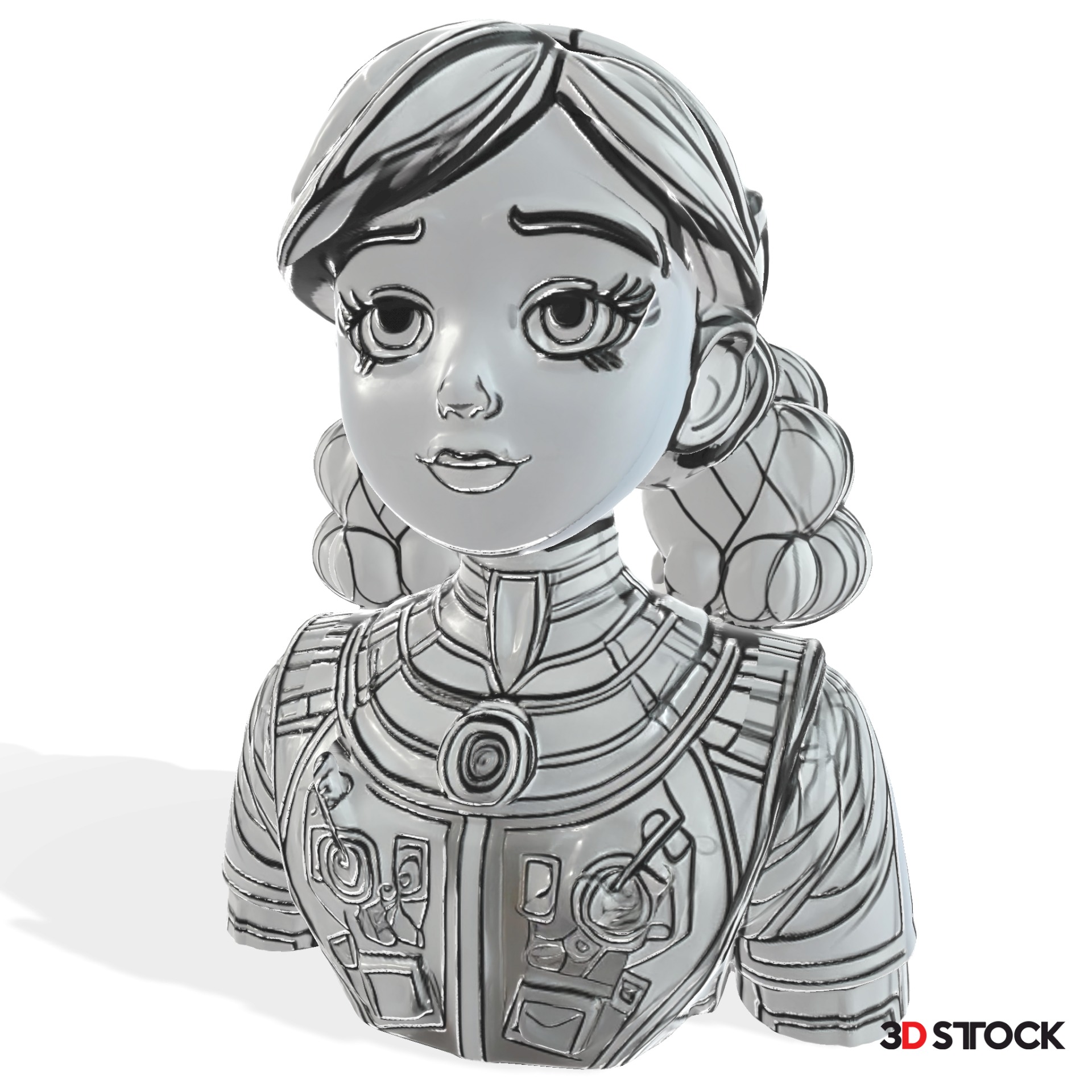 This adorable bust features a charming anime-style character design of a young space explorer! The model captures a youthful female character with expressive large eyes, cute facial features, and hair styled in braided pigtails. She's wearing what appears to be a detailed space suit or advanced armor with intricate panel designs and geometric patterns around the collar area. The monochromatic grayscale design gives it a sleek, modern appearance while maintaining the detailed line work that brings out the character's personality.