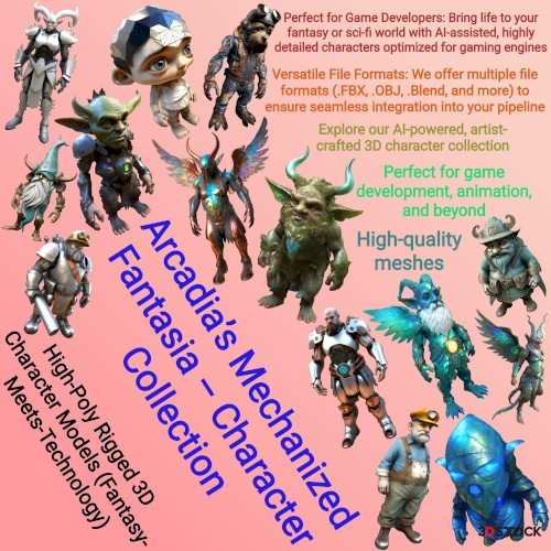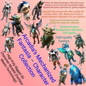 Discover a world where whimsical fantasy creatures blend seamlessly with advanced mechanical designs. These detailed 3D models feature everything from small goblin-like inventors, mighty horned guardians, ethereal winged beasts, and more—all sporting unique techno-organic accents and intricate armor. Perfect for video game developers, animators, or collectors looking to add a touch of imaginative wonder to their projects. Each character is designed to bring life to your creative endeavors with custom textures, high-quality meshes, and well-optimized rigs, ready to be animated or posed as you see fit.