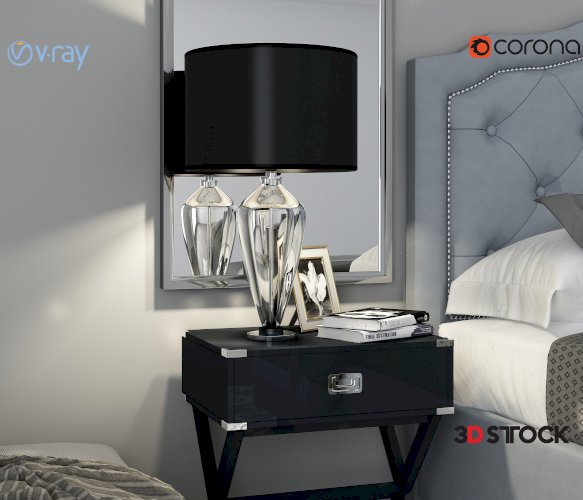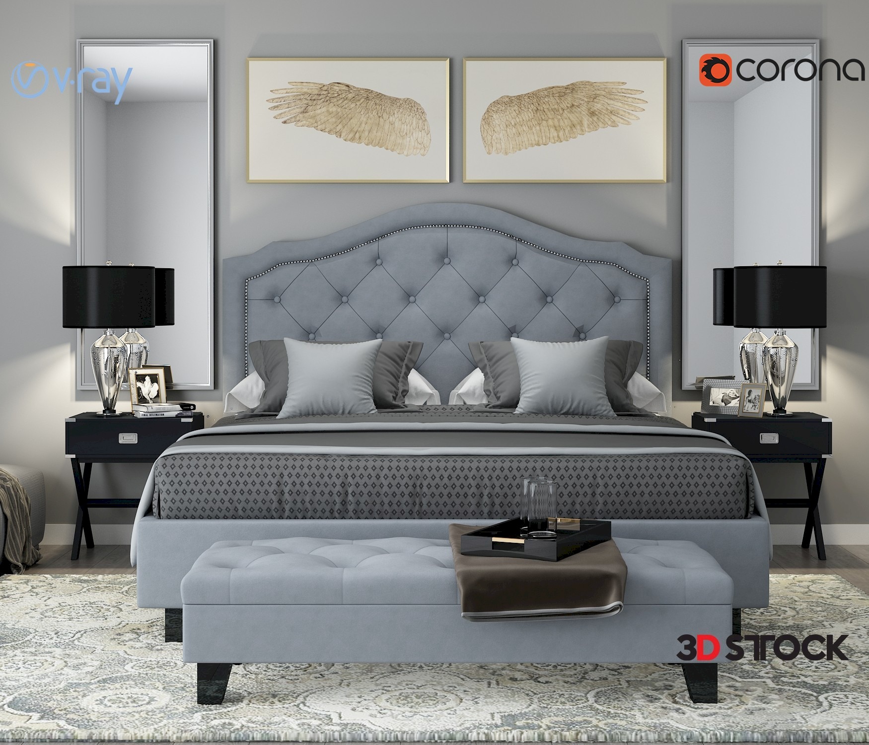 Tag: Blue bed, black lampshade, angel painting, carpet, mirror, pillow, book.