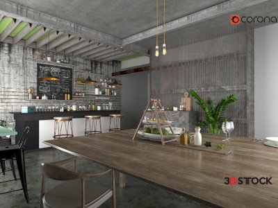 Cafe restaurant model, stools, table and chair, potted plant, pendant lighting, bottles, spices, fork, spoon, knife.