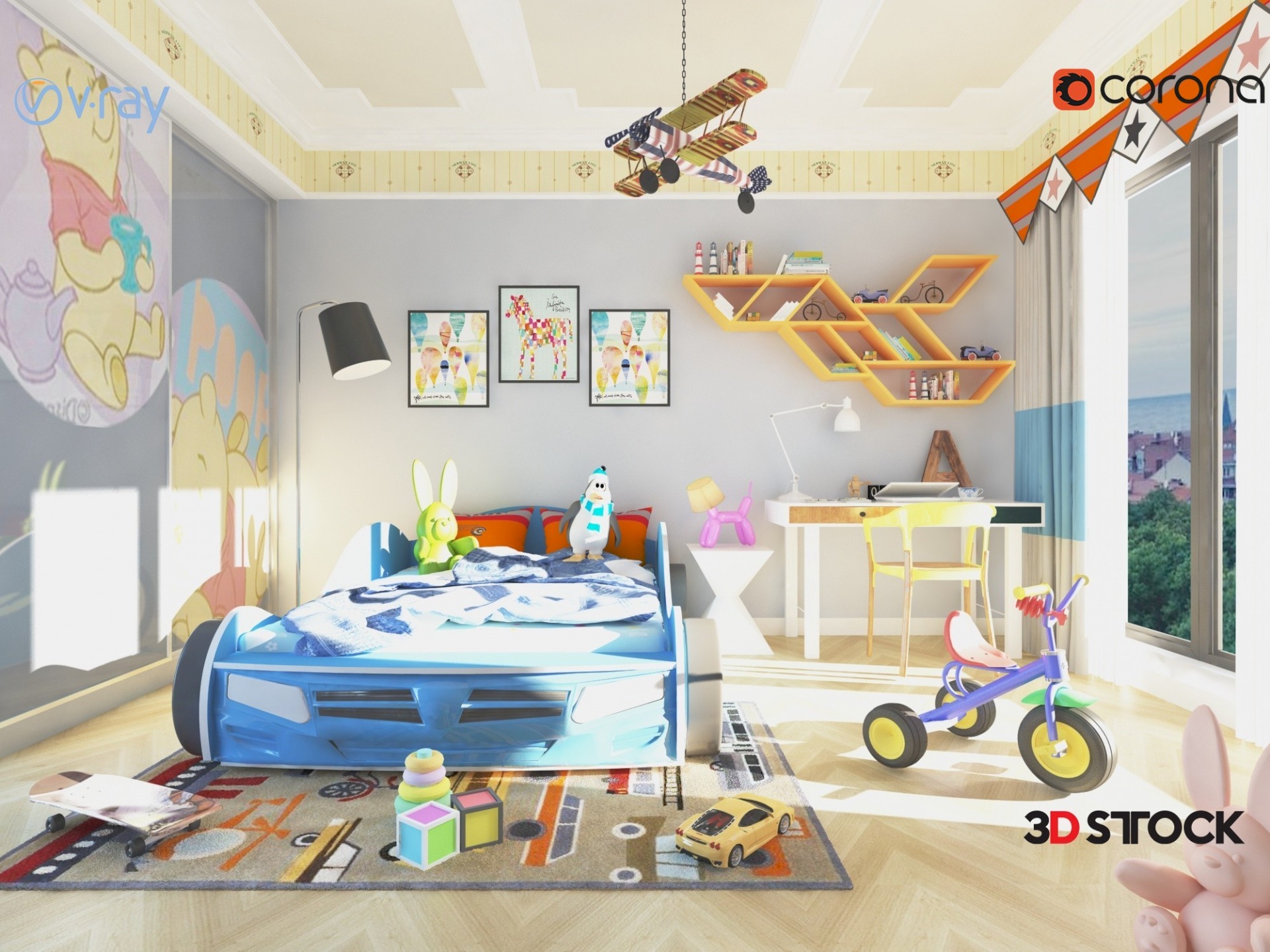 Children's Bedroom Set, bed, baby bike, lampshade, toy models, decorative shelf, aircraft model chandelier, floor lighting, desk and chair, curtain.