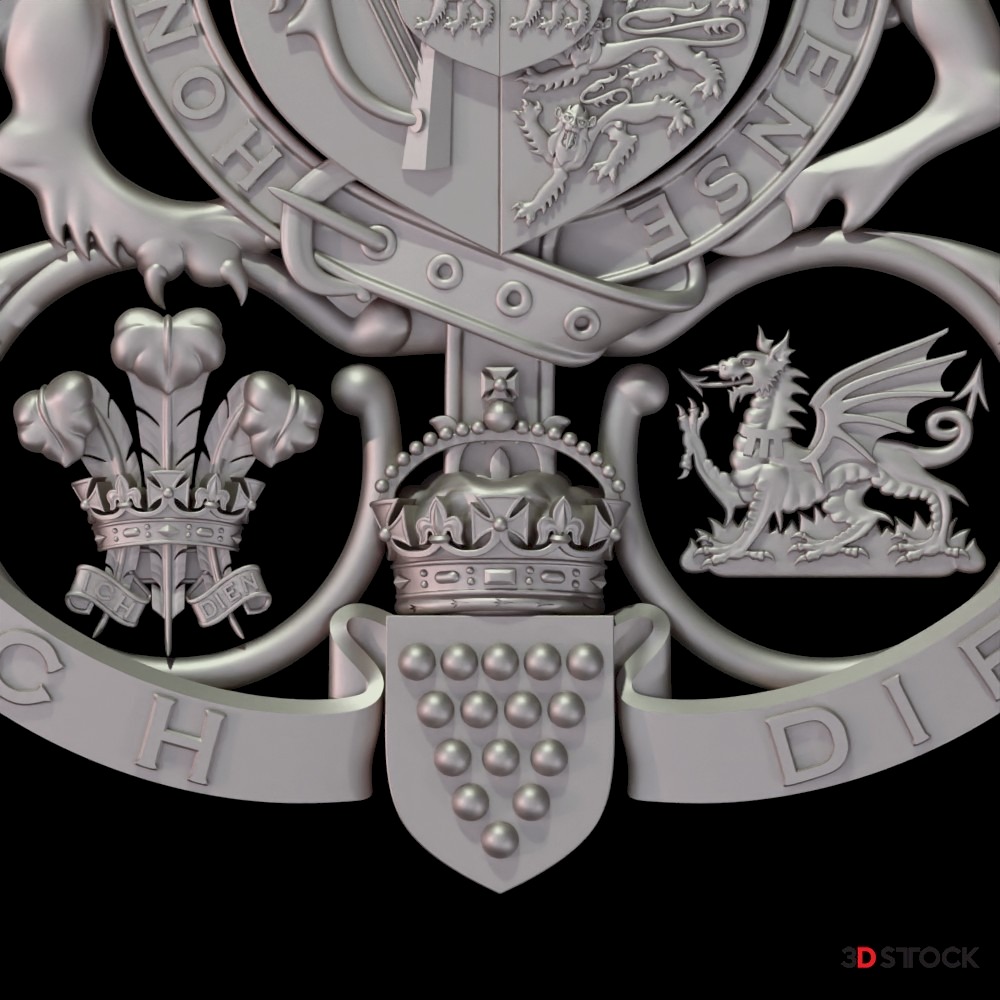 Coat of arms of Prince of Wales, bas-relief. High poly model. Heraldically accurate 3d model can be used for 3D printing and for CNC machines. Formats: STL, OBJ, FBX, 3MF