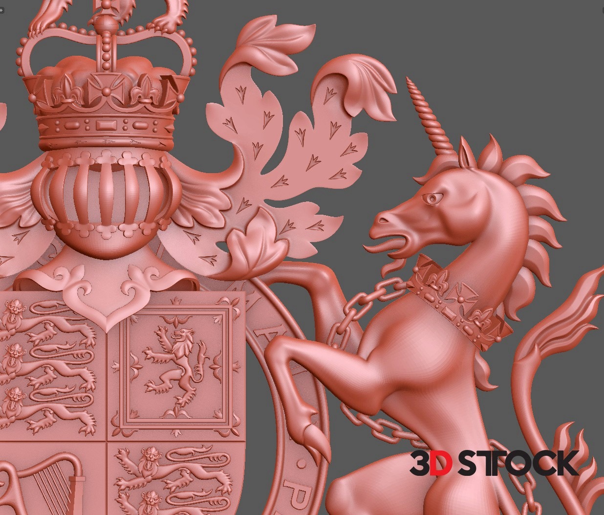 Royal coat of arms of the United Kingdom, bas-relief. High poly model, coat of arms of the UK, symbol of UK. Heraldically accurate 3d model can be used for 3D printing and for CNC machines.