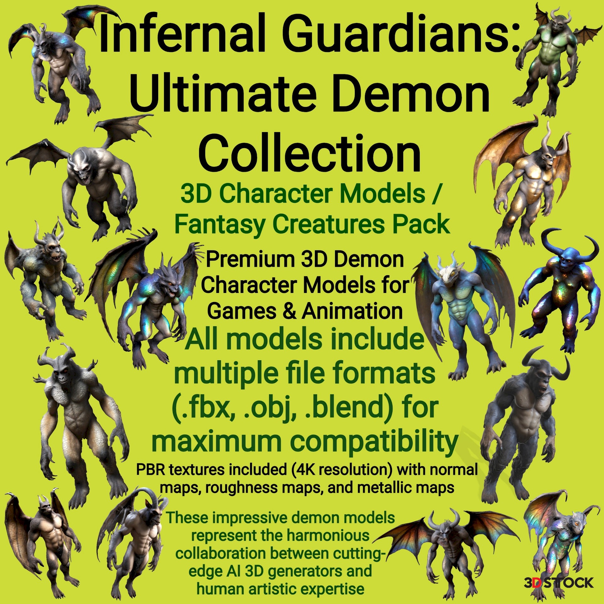 These impressive demon models represent the harmonious collaboration between cutting-edge AI 3D generators and human artistic expertise. Our process began with AI-assisted concept generation to explore diverse anatomical possibilities and mythological references. Human artists then took these foundations and meticulously refined each model, adding character-defining details, optimizing geometry for practical use, and ensuring technical compatibility across platforms. This synergy between AI efficiency and human creativity has allowed us to create an exceptionally diverse and detailed collection while maintaining the authentic artistic vision that brings these underworld sentinels to life.