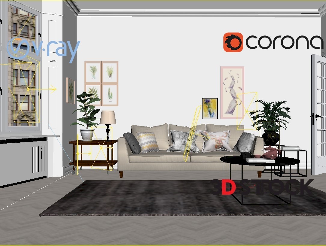 Whiye sofa , gray carpet , decorative plant , ceiling lighting.