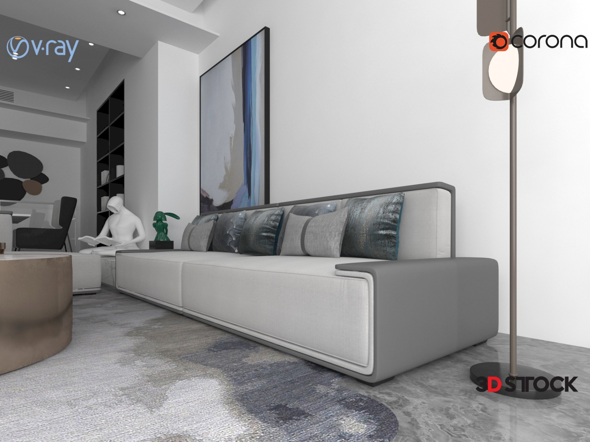 Gray living room set and desk, floor lighting, blue beanbag sofa, gray sofa, gray armchair, coffee table, decorative products, white carpet.
