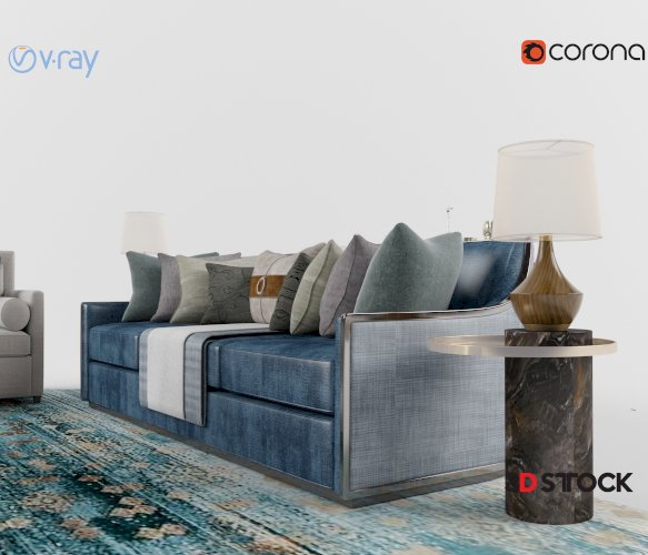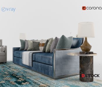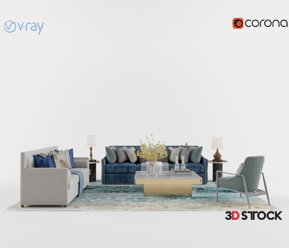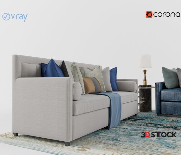 Cream color living room set. Tag: Cream-colored sofa bed, blue sofa bed, gray chair, lampshade, coffee table, carpet.
