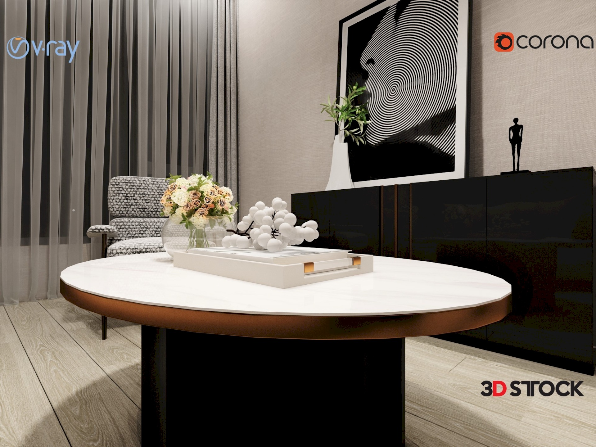 Living room set, cream-colored sofa, coffee table, decorative lighting and plant, wall accessory, storage cabinet, gray armchair, curtain, tulle.