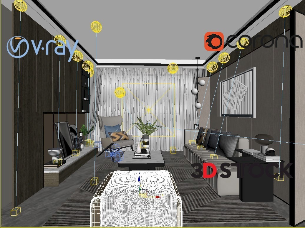 Living room set, gray sofa, armchair, pillow, decorative plant, painting table, coffee table, curtain, tulle.