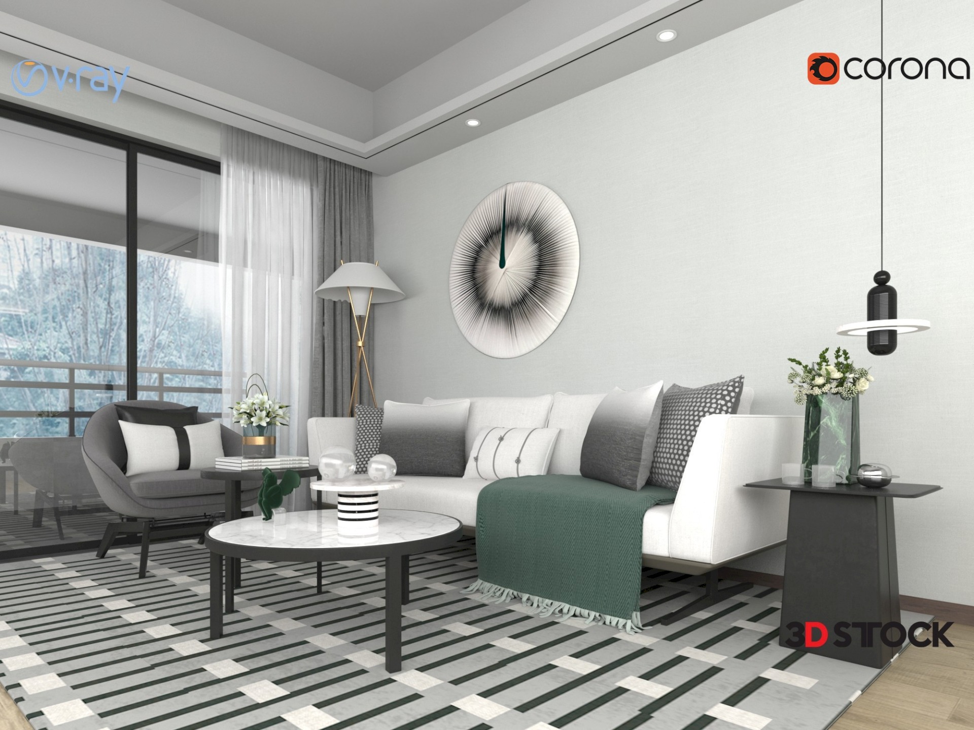 Living room set, white sofa, gray armchair, carpet, marble coffee table, duvet decor, pendant lighting, spot lighting, pillows, curtains, tulle.