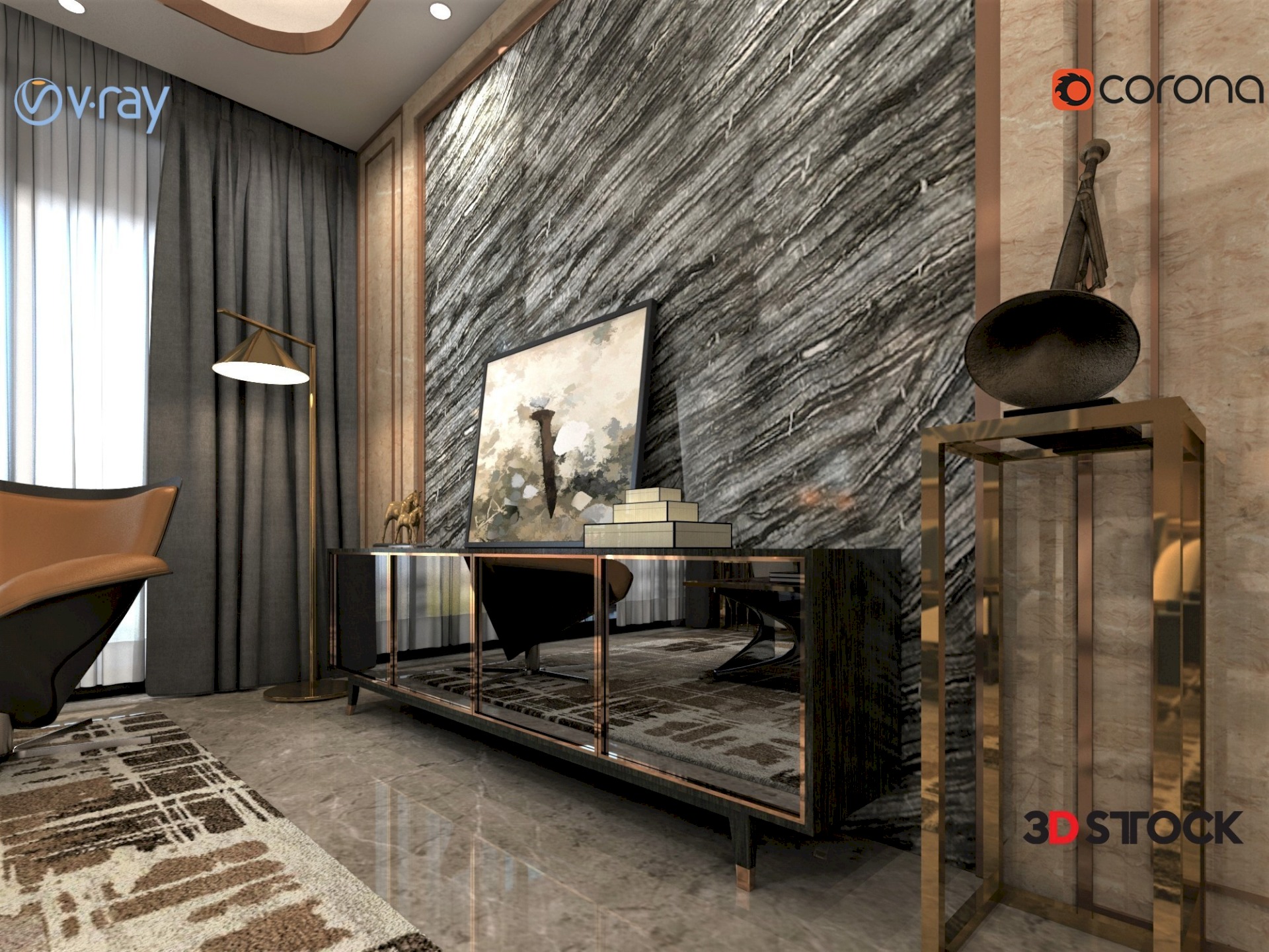 Modern living room set, gray sofa, storage cabinet, decorative products, lampshade, ceiling lighting, painting table, decorative plant, saxophone, carpet, armchair.