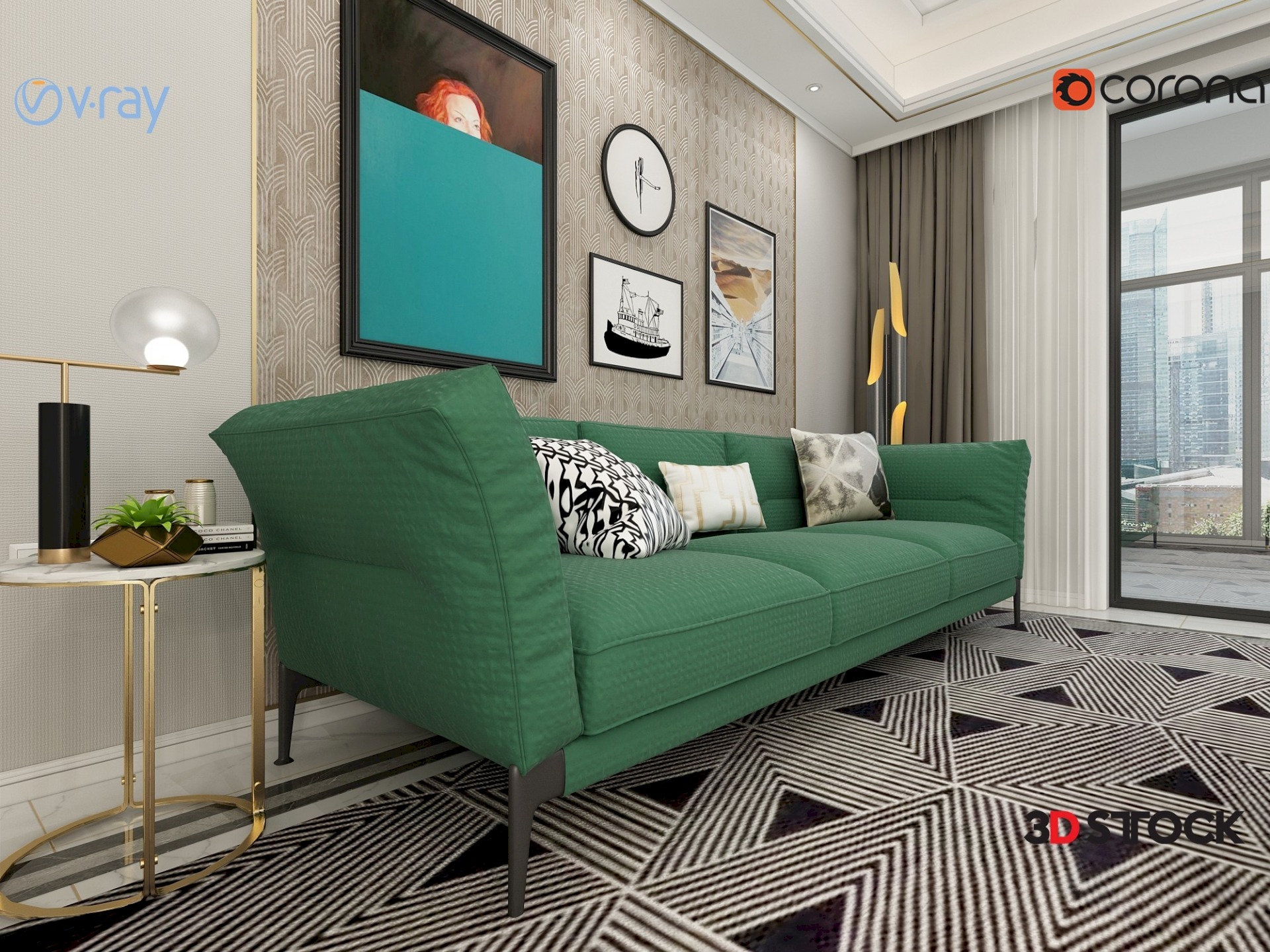 Tag: Green sofa, coffee table, decorative products, floor lighting, ceiling lighting, socket, clock, picture table, tv, tv unit, curtain, carpet, tulle, glass.