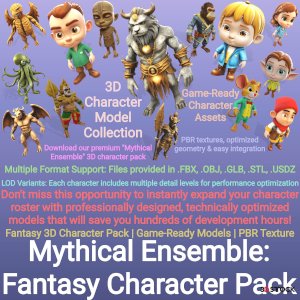 Unleash your creativity with "Mythical Ensemble," a diverse collection of fantasy and cartoon-inspired 3D character models perfect for game development, animation, or virtual worlds! This pack features 14 uniquely designed characters spanning mythical creatures, adorable protagonists, and memorable sidekicks - all meticulously crafted with AI assistance and artistic refinement.