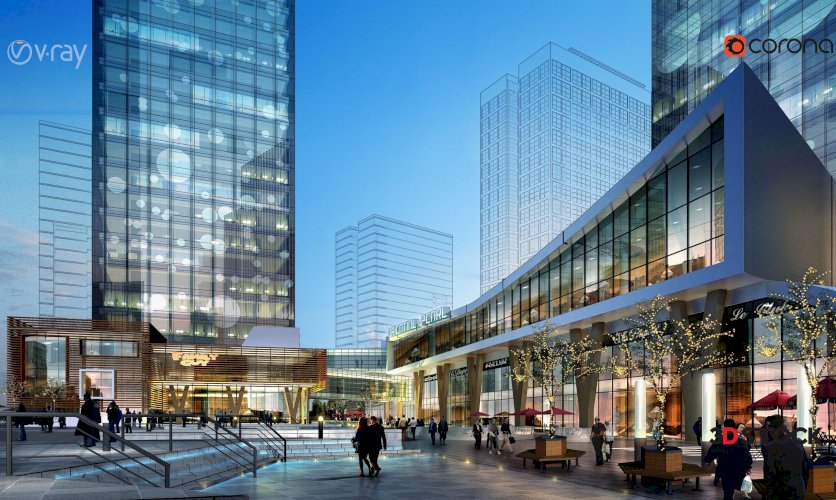 Shopping center, human models, residence model, shops.