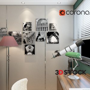 Study Room Set Desk Table Chair Armchair Floor Lamp Telescope Laptop Parquet Wallpaper Frame Art Book Shelf