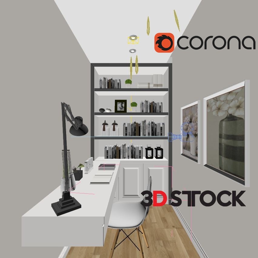 Study Room Set Desk Table Chair Armchair Table Lamp Parquet Wallpaper Frame Art Book Shelf Accessories Decorative Product